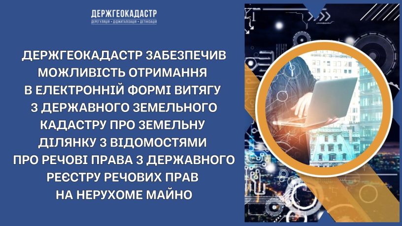 Держгеокадастр забезпечив впровадження функціоналу щодо надання відомостей з Державного земельного кадастру у формі витягу про земельну ділянку з відомостями про речові права на земельну ділянку, їх обтяження, одержаними в порядку інформаційної взаємодії з Державного реєстру речових прав на нерухоме майно, в електронній формі.